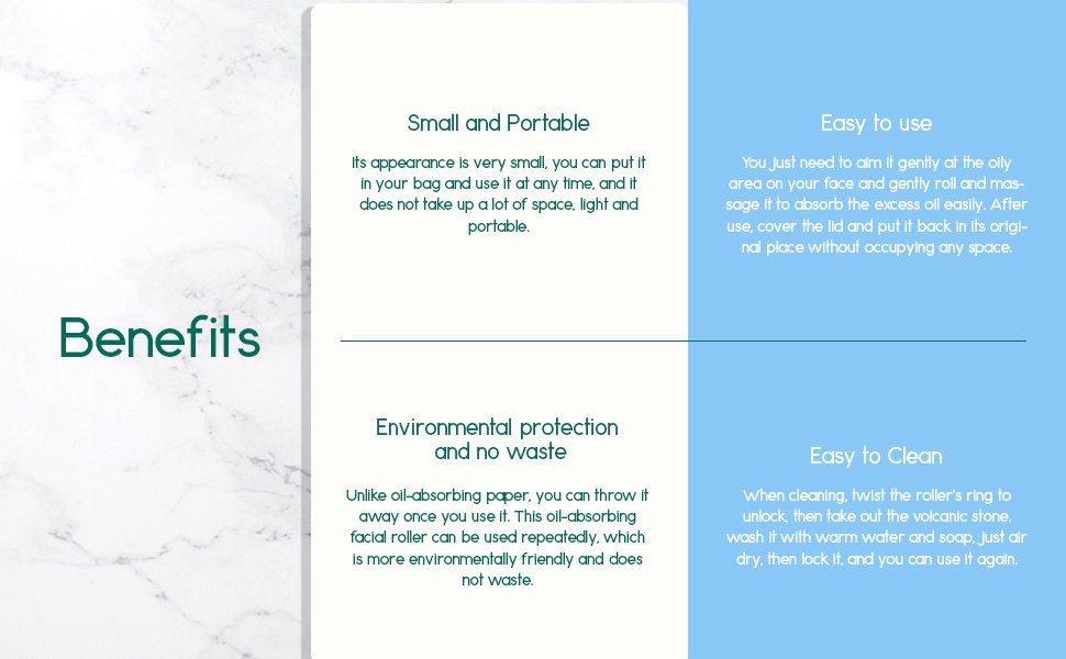 Our roller is made of natural volcanic stone. It has excellent absorption capacity; which can instantly remove excess facial oil; restore clean matte skin; keep our makeup always clean; and can be reused. The volcanic stone roller is very light. Its excellent design; lightweight; and convenient size make it portable.